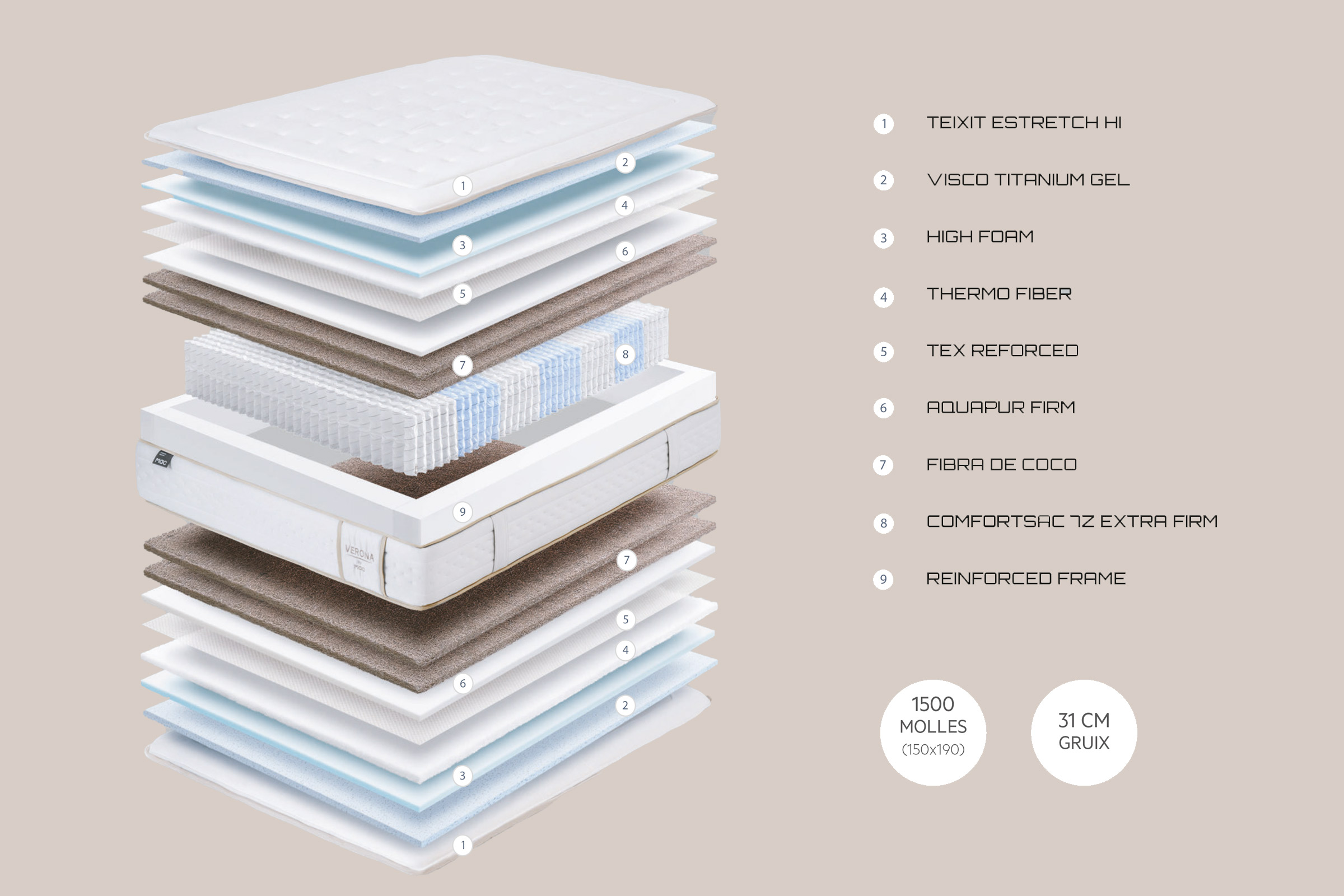 El seu disseny es completa amb un marc perimetral extra ferm que aporta estabilitat i reforça les vores, millorant la durabilitat i el confort en l’ús diari. Amb una alçada total de ±31 cm i 1.500 molles (en mida 150×190 cm), és una opció pensada per a qui busca qualitat, transpirabilitat i un descans realment reparador.