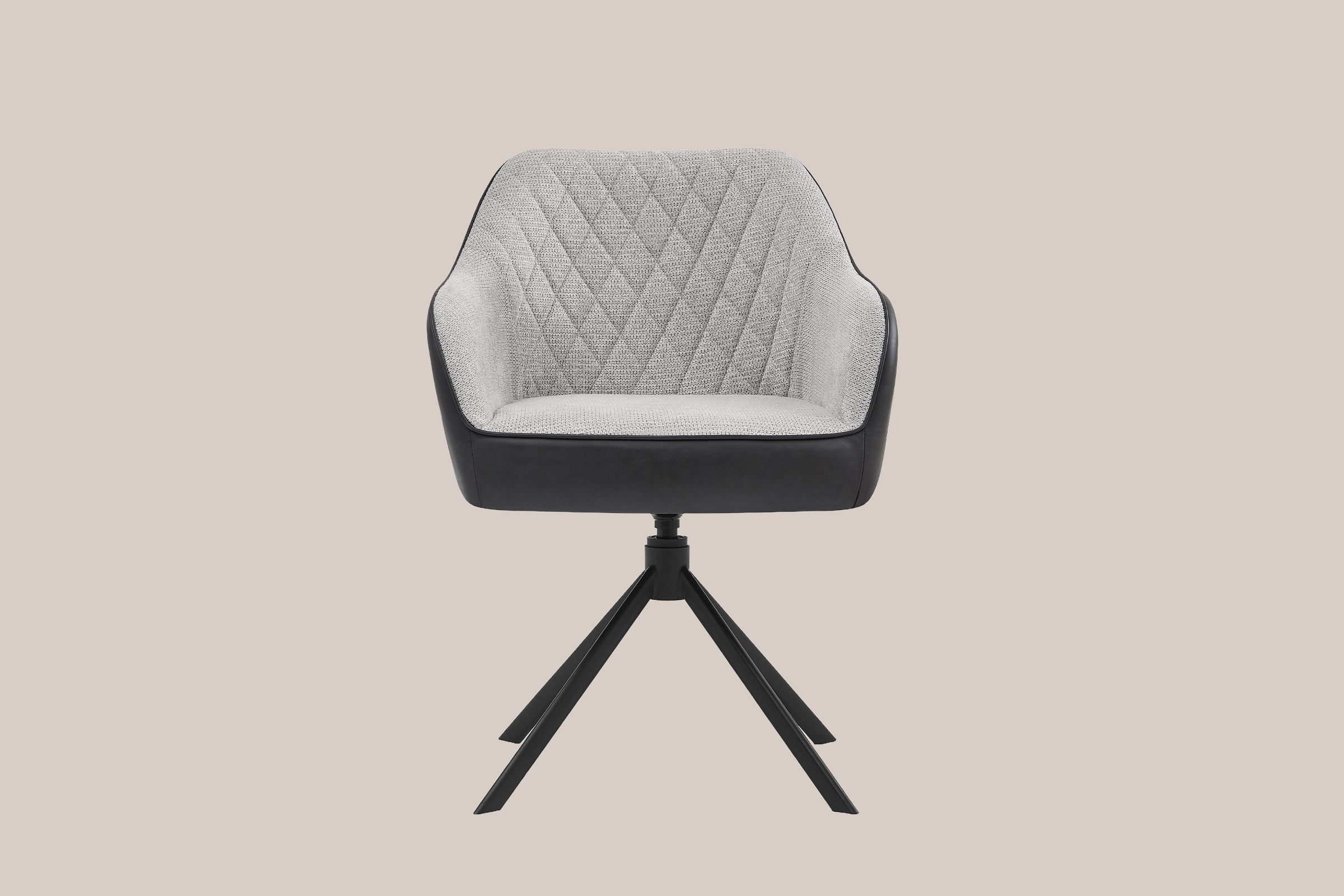 Cadira de menjador giratòria amb reposabraços, estructura metàl·lica i teixit antitaques, pensada per oferir màxim confort amb funcionalitat 360º i un disseny actual.