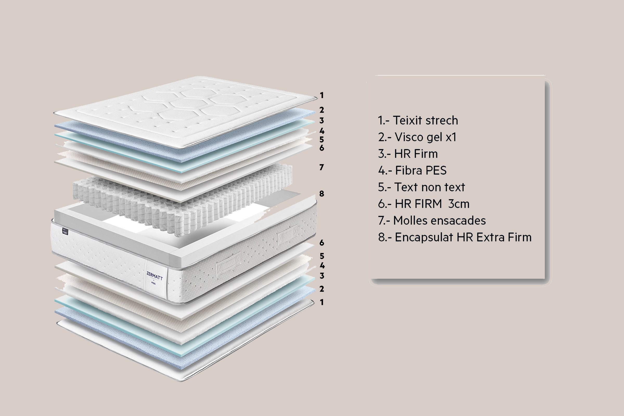 Nucli: Molles ensacades de 16 cm (252 molles/m²) + escuma HR ferma.
