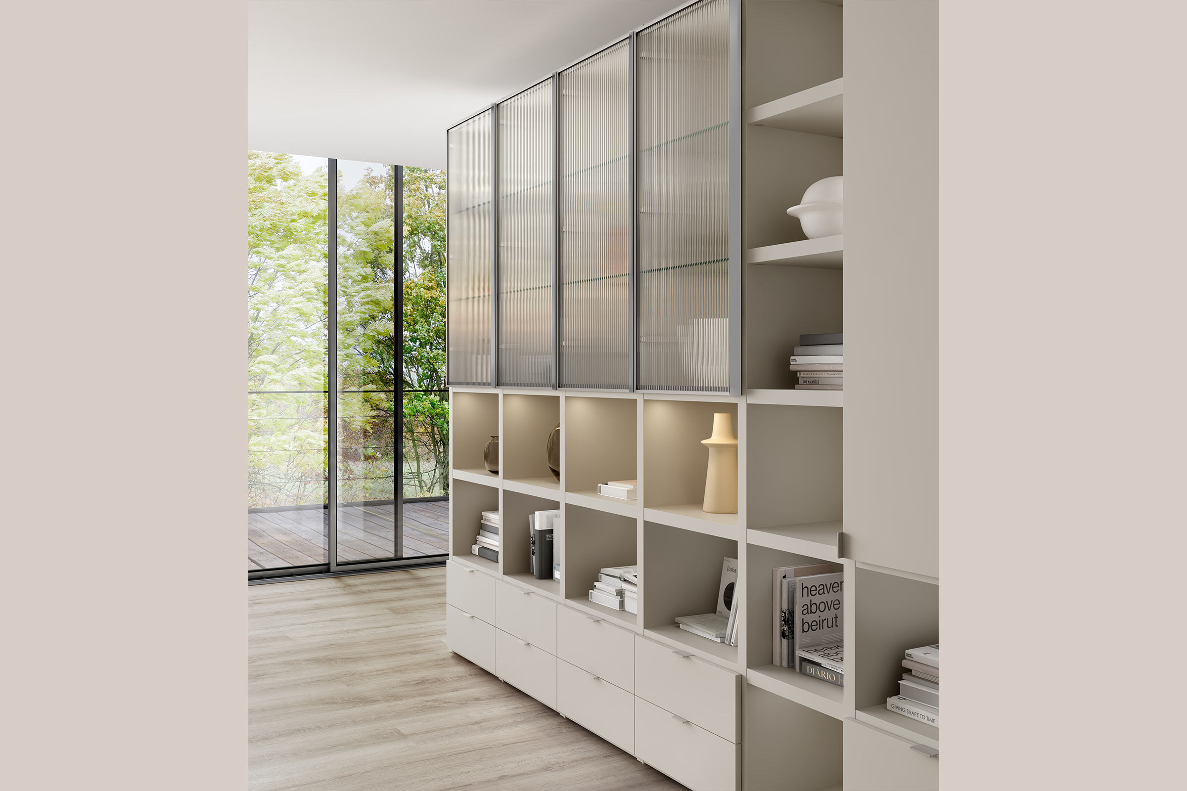 El conjunt incorpora quatre mòduls amb porta de vidre acanalat, equipats amb prestatges interiors ideals per exposar vaixella o objectes decoratius. S’hi sumen dos buits oberts i dos calaixos, perfectes per mantenir l’ordre al dia a dia, així com un mòdul amb prestatgeries i dos mòduls addicionals amb porta, un buit i dos calaixos cadascun.